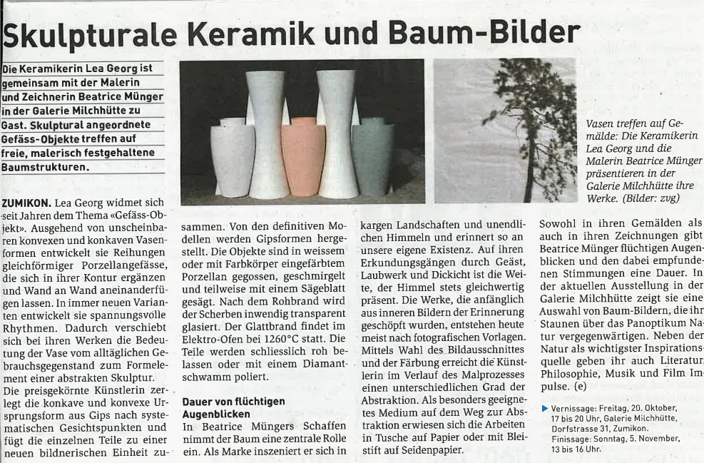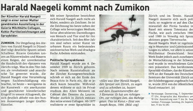 Presse Pressetexte Ausstellung Harald Naegeli Ausstellung Lea Georg & Beatrice Münger Sammelausstellung Kunstblick 2017: Anflug aus Süden Beispiele von Medienmitteilungen und Pressetexten FZZ Text zur Ausstellung Hans Falk Text zur Ausstellung Caroline Vögele-Ott