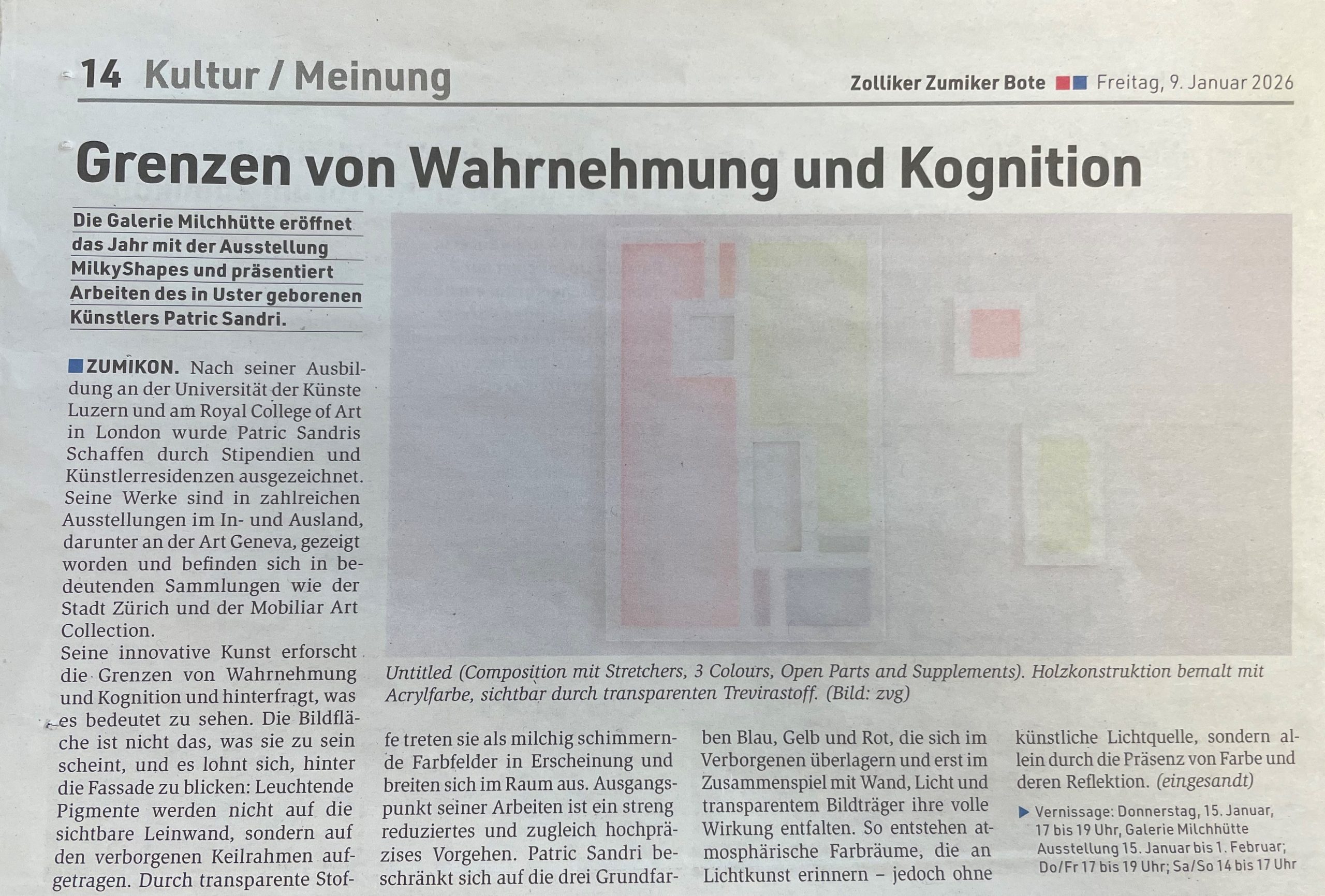Presse Pressetexte Ausstellung Patric Sandri Ausstellung Harald Naegeli Ausstellung Lea Georg & Beatrice Münger Sammelausstellung Kunstblick 2017: Anflug aus Süden Beispiele von Medienmitteilungen und Pressetexten FZZ Text zur Ausstellung Hans Falk Text zur Ausstellung Caroline Vögele-Ott