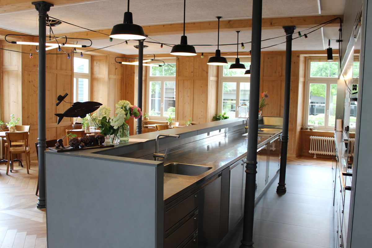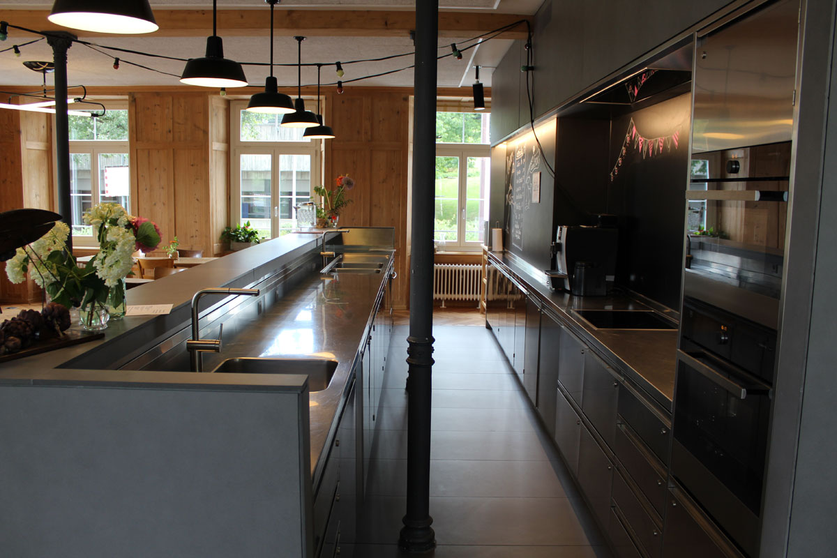 Küche mit Gastro-Geschirrspüler, 2 Kühlschränke, grosser zusätzlicher Kühlschrank gegen Aufpreis, Geschirr, Gläser, Besteck, Kochgeschirr, Kaffeemaschine (Delizio Kapseln, ‚Migros‘), Bartheke, 7 Bistrotische für 2-3 Personen und 2 rechteckige Tische für 6-8 Personen mit 23 Stühlen, 1 Kindersitz, 1 Triptrap, Musikanlage. Nach Bedarf sind weitere Tische (max.12 Stk. à 80×180 cm) und Stühle vorhanden.