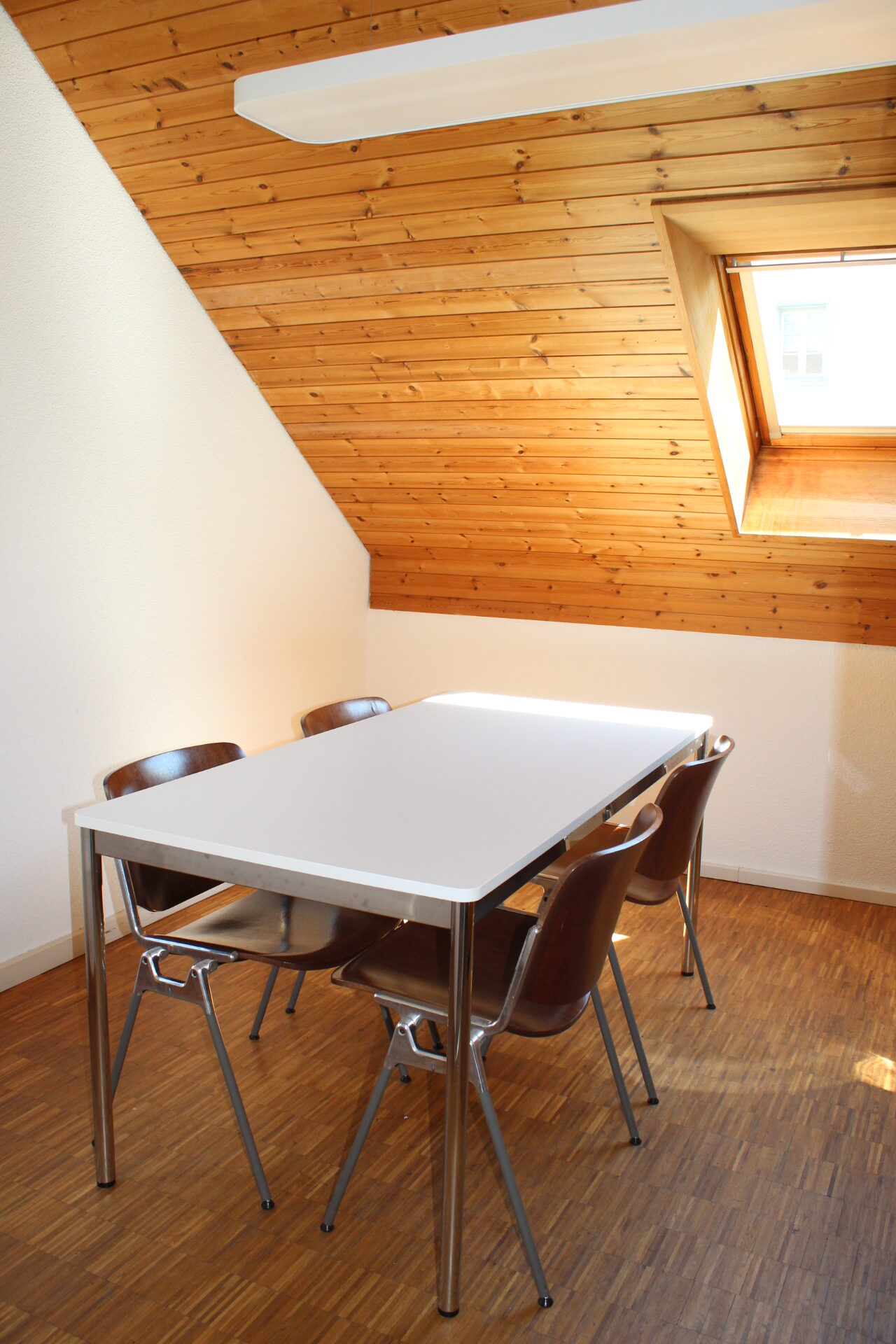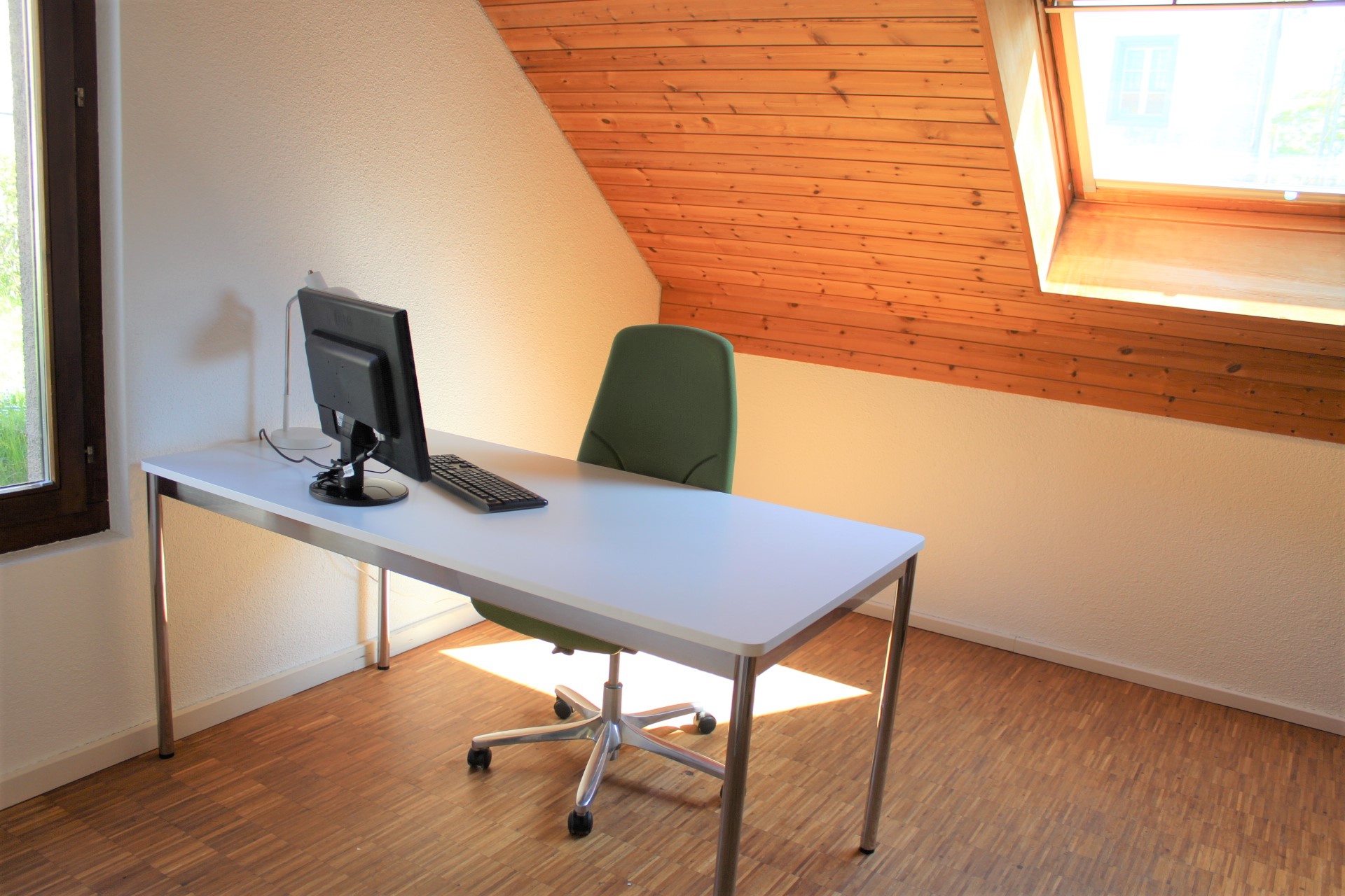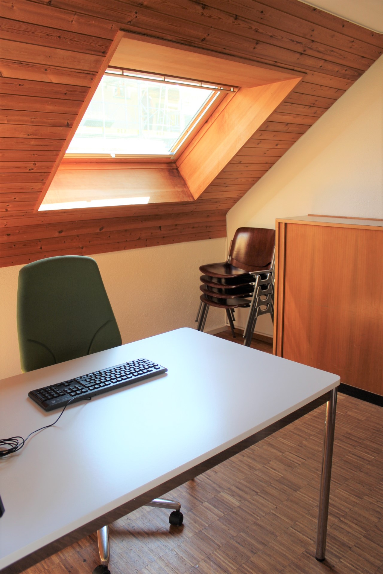 Der kleine Raum mit Dachschräge und zwei Fenstern eignet sich ideal für eine Person als Büroraum, den man (halb-)tageweise nutzen kann.