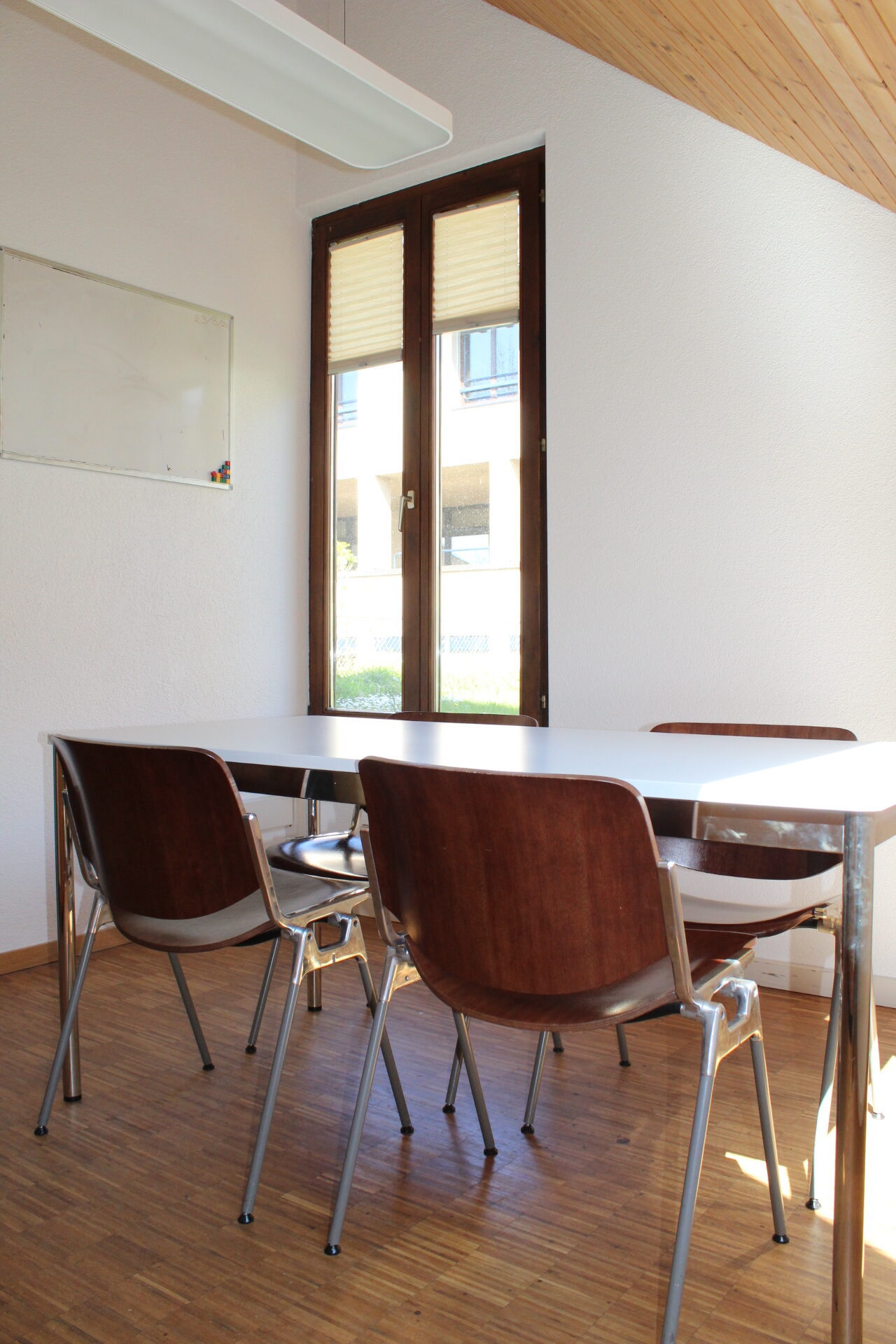 Schreibtisch, Schreibtischstuhl, Tischlampe, Kommode, Standventilator (im Sommer), Magnetwand, WLAN, Kaffeemaschine zur Mitbenützung im kleinen Konferenzzimmer (gleich nebenan, Delizio-Kapseln selber mitbringen), Stühle.
