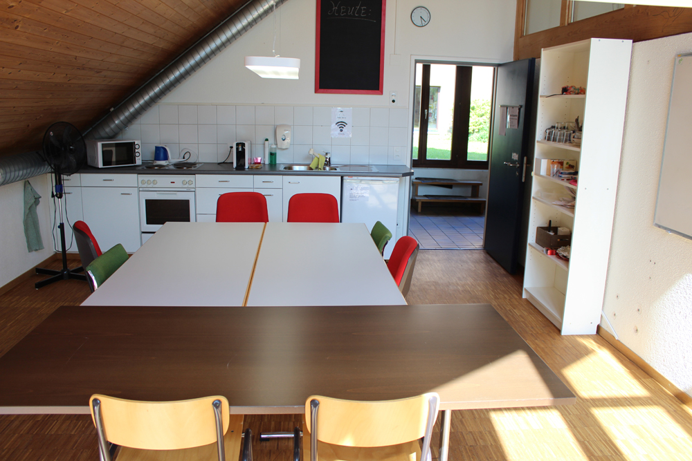 5 rechteckige Tische für 6-8 Personen (80×180 cm), 12 Stühle, Whiteboard, Beamer (Aufpreis), kleine Küche: Kaffeemaschine (Delizio Kapseln ‚Migros‘), Wasserkocher, Mikrowelle, Backofen, Herd, Kühlschrank.
