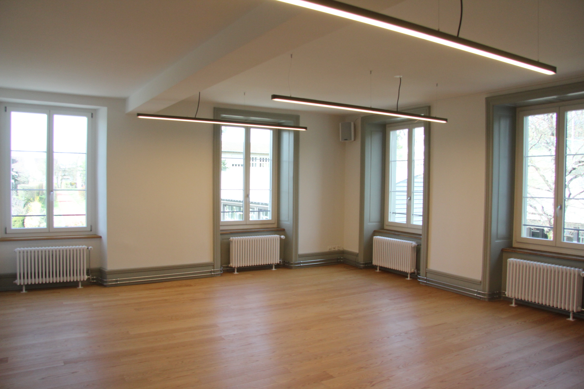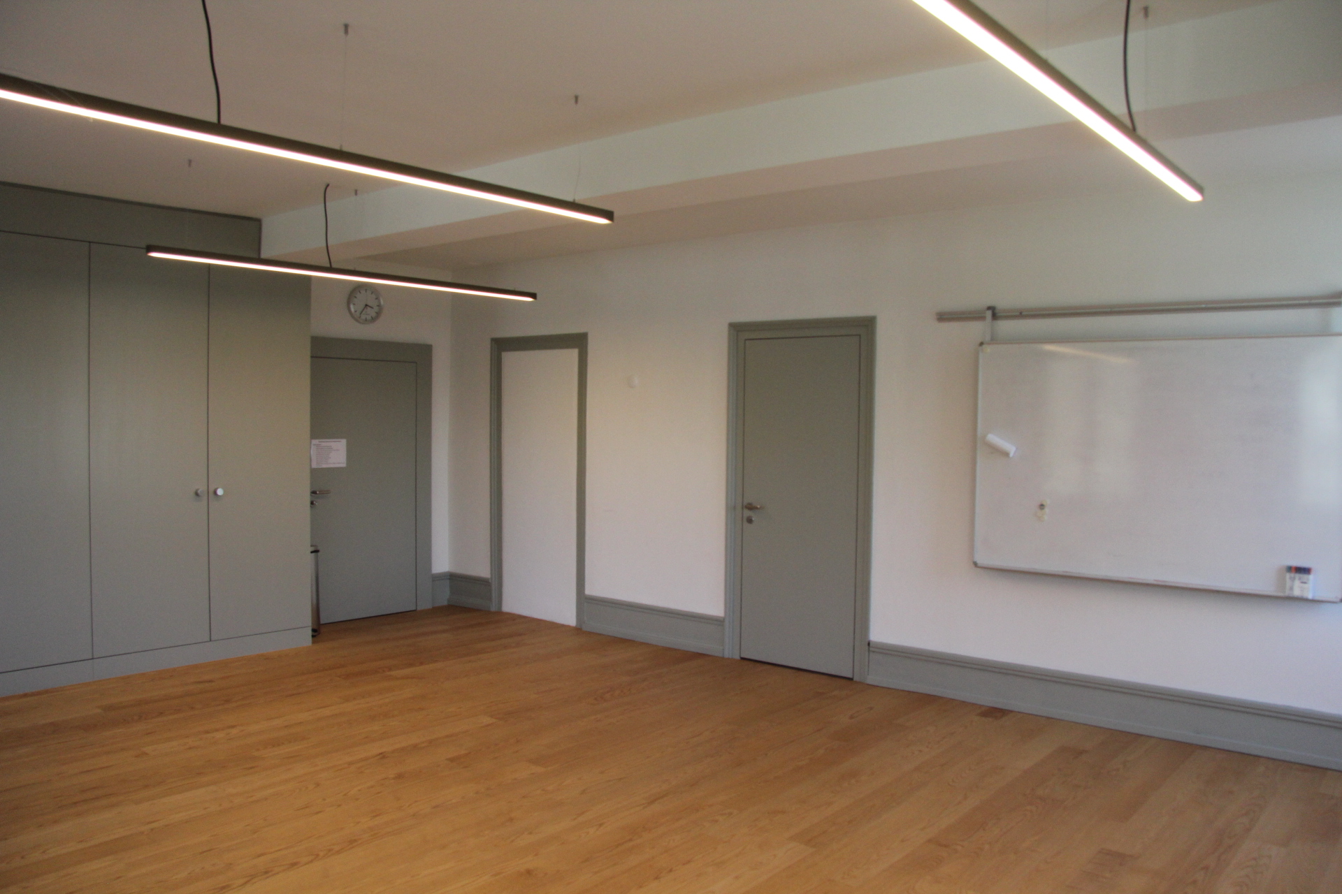 Im hellen Mehrzweckraum mit Holzboden kann man sich sehr gut bewegen. Er eignet sich für Tanzproben, Yogastunden und Kampfsporttraining, aber auch für Sitzungen und Konferenzen. Er ist mit einem grossen Whiteboard und mit Boxen für einen digitalen Tonträger ausgestattet.